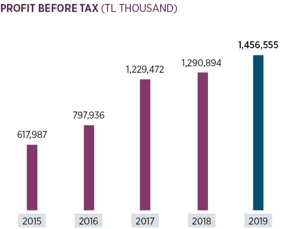 Pre-tax profit increased by 12.9% and reached TL 1,457 million in 2019.