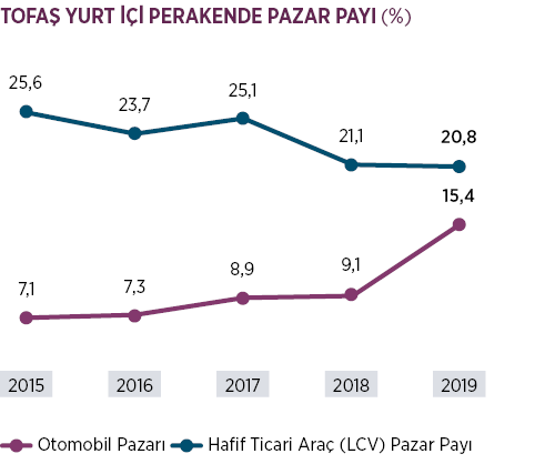 2019 yılında yurt içi perakende otomobil pazarı 2018 yılına göre %20,4 daralarak 387.256 adet olarak gerçekleşmiştir. Tofaş’ın Fiat, Fiat Professional, Jeep®, Alfa Romeo, Maserati ve Ferrari markaları ile toplam otomobil pazar payı 59.602 adet satış ile %15,4 olarak gerçekleşmiş ve sektörün oldukça üzerinde bir performans ile otomobil pazar payında yıllık 630 baz puanlık bir artış sağlanmıştır.