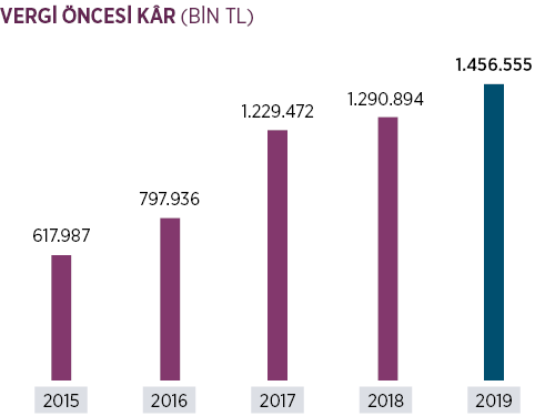 2019 yılında %12,9 oranında artan vergi öncesi kâr 1.457 milyon TL olarak kaydedilmiştir.