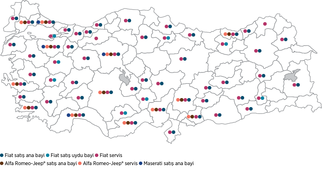 Fiat, Alfa Romeo ve Jeep® markalarına hizmet eden Tofaş bayi ağında 71 adet Fiat ana bayisi bulunmaktadır. Ana bayilere bağlı olarak faaliyet gösteren diğer noktalarla birlikte Türkiye genelindeki toplam Fiat satış noktası adedi 97, toplam Fiat servis noktası adedi ise 122’dir. Alfa Romeo-Jeep® ana bayi sayısı ise 18 adettir. Sadece servis hizmeti veren 4 ayrı nokta da bulunmaktadır.