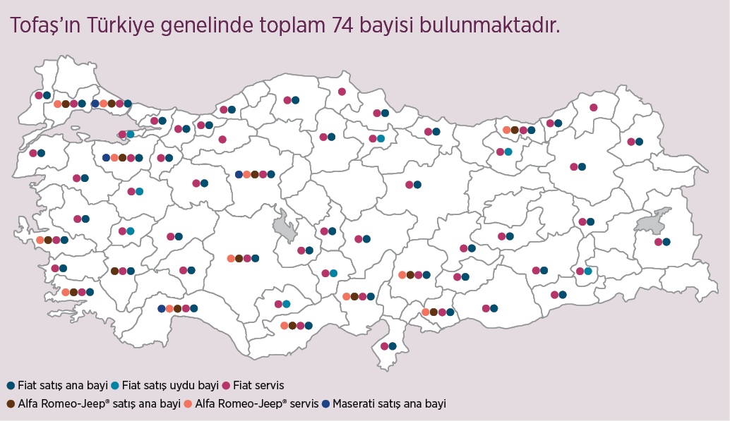Fiat, Alfa Romeo ve Jeep® markalarına hizmet eden Tofaş bayi ağında 71 adet Fiat ana bayisi bulunmaktadır. Ana bayilere bağlı olarak faaliyet gösteren diğer noktalarla birlikte Türkiye genelindeki toplam Fiat satış noktası adedi 97, toplam Fiat servis noktası adedi ise 125’tir. Alfa Romeo-Jeep® ana bayi sayısı ise 19 adettir. Sadece servis hizmeti veren 5 ayrı nokta da bulunmaktadır.