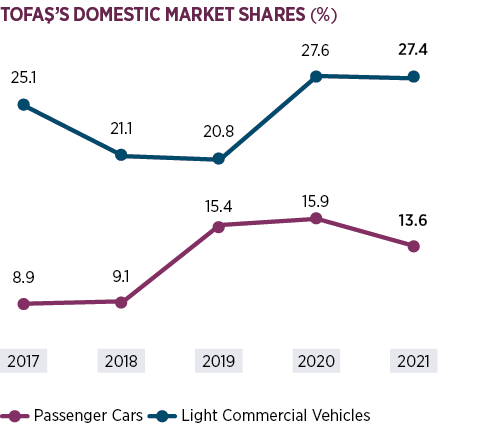 Sales in the overall LCV market increased by 7.9% in 2021 and amounted to 175,497 units sold. Tofaş’s own sales in this market were up by 7.1% year-on, a performance which parallels that of the market as a whole. Tofaş’s robust growth in LCV sales (up 6.8% in 2020) was sustained last year. Its Fiat and Fiat Professional models commanded a 27.4% market share and put the brand in second place once again. Fiat’s Doblò and Fiorino sales also upheld the company’s leadership of the car-derived van segment.