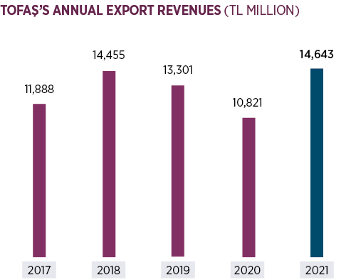 Taking all of these results into account, Tofaş’s export earnings were up by 35.3% year-on in 2021 and weighed in at TL 14,643 million.