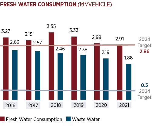 Tofaş makes use of groundwater at its plant. In 2020, an average of 2.98 m3 of fresh water was consumed for every vehicle that was made at the plant; in 2021 this figure was 2.91 m3/vehicle. The company has set itself the goal of further reducing its fresh-water consumption to 2.86 m3/vehicle by 2024 with the assistance of water-recycling projects.