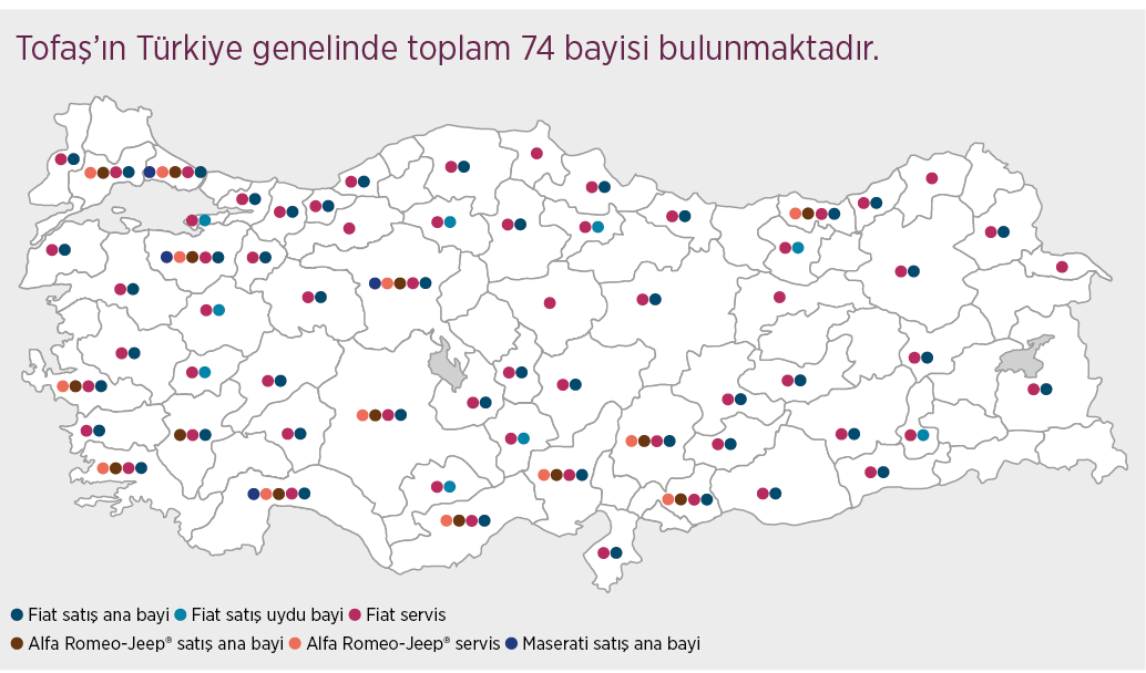 Fiat, Alfa Romeo ve Jeep® markalarına hizmet eden Tofaş bayi ağında 71 adet Fiat ana bayisi bulunmaktadır. Ana bayilere bağlı olarak faaliyet gösteren diğer noktalarla birlikte Türkiye genelindeki toplam Fiat satış noktası adedi 100, toplam Fiat servis noktası adedi ise 128’dir. Alfa Romeo-Jeep® ana bayi sayısı ise 22 adettir. Sadece servis hizmeti veren 5 ayrı nokta da bulunmaktadır. 2021 yılında Efsane Gebze, Kayseri İnciroğlu ve Erkay bayileri Alfa Romeo ve Jeep satış ve servis hizmetine başlamıştır.