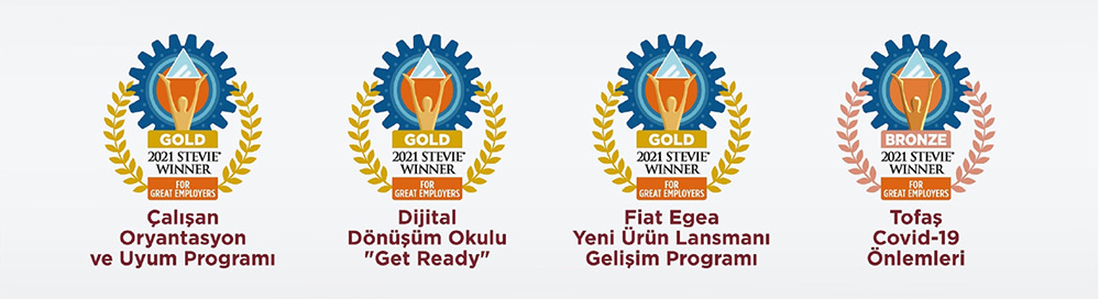 Tofaş, geliştirdiği yenilikçi öğrenme/gelişim çözümleri ve çalışan deneyimine dokunan insan kaynakları uygulamaları ile The Stevie Awards’dan farklı kategorilerde 3’ü altın, 1’i bronz olmak üzere 4 ödüle layık görüldü. “Çalışan Oryantasyon ve Uyum Programı”, “Dijital Dönüşüm Okulu Get Ready” ve “Fiat Egea Yeni Ürün Lansmanı Gelişim Programı” Altın Ödül sahibi olurken; “Covid-19 Önlemleri” Bronz Ödül aldı.