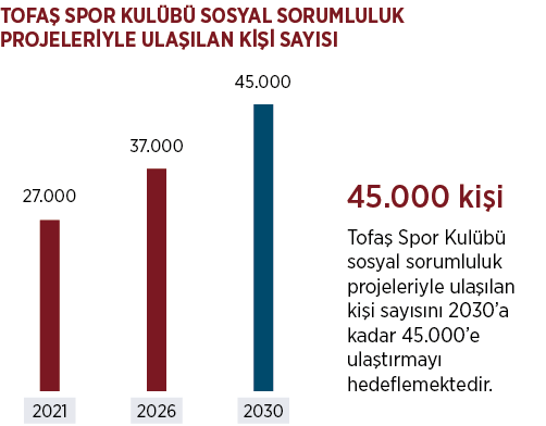 Tofaş Spor Kulübü’nün öncelikleri; altyapısından sporcu yetiştirmek, A takımı ve sosyal sorumluluk projeleridir. Kulüp bünyesinde yapılan sorumluluk projeleri ile 2021 yılına kadar ulaştığı 27.000 kişi sayısını 2030 yılına kadar toplam 45.000’e ulaştırmayı hedeflemektedir.