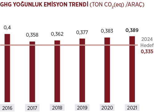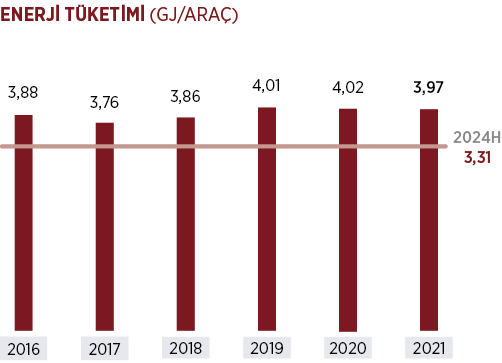 Karbon emisyonlarını azaltma hedefi doğrultusunda sabit enerji tüketimlerini azaltmak amacı ile yapılan çalışmalar sonucunda Tofaş, 2021 yılında gerçekleşen araç başı enerji tüketimini 3,97 GJ ile hedeflenen değerden daha iyi gerçekleşmesini sağlamıştır.