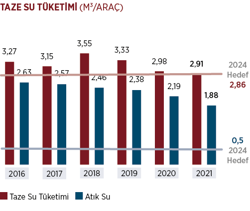 Tofaş’ta yer altı suyu kullanılmaktadır. 2020 yılında araç başına 2,98 m3 düzeyinde olan taze su tüketimi 2021 yılında 2,91 olarak gerçekleşmiştir. Taze su tüketiminin geri dönüşüm projeleri yardımı ile 2024 yılına gelindiğinde 2,86 m3 seviyesi çekilmesi hedeflenmektedir.