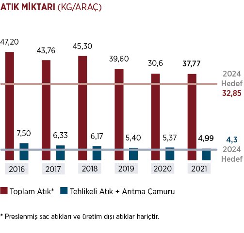 Tofaş, Çevre ve Enerji Politikası’nın gereği olarak atıkları kaynağında azaltmayı ve mümkün olduğunca fazla geri kazanımı hedeflemektedir. Bu kapsamda, üretim süreçlerinde oluşan endüstriyel atıkların %100’ü malzeme geri kazanımında ve çimento sektöründe hammadde ve enerji kaynağı olarak kullanılmakta, böylece “Sıfır Atık Bertarafı” hedefine ulaşılmaktadır.