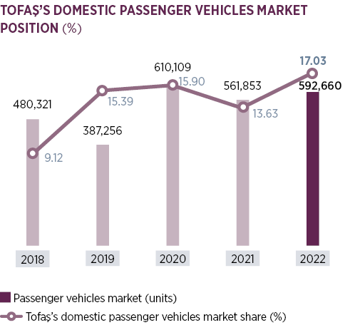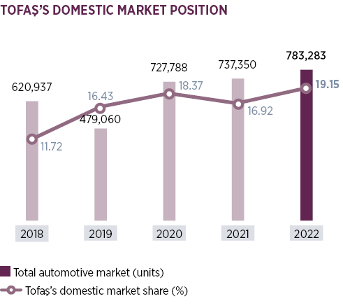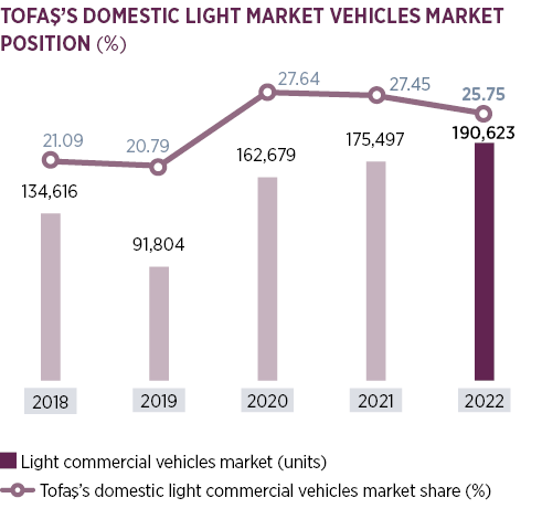 Sales in the overall LCV market increased by 8.6% in 2022 and amounted to 190,623 units sold. Tofaş’s Fiat and Fiat Professional brands yet again defended their strong position with a combined 25.7% share of that market.