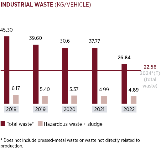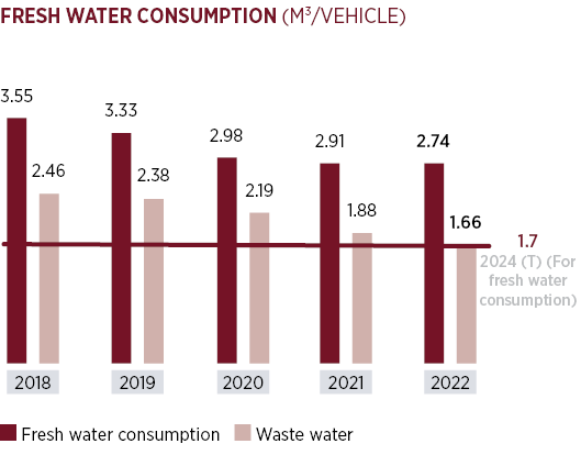 Tofaş makes use of groundwater at its plant. In 2021, an average of 2.91 m3 of fresh water was consumed for every vehicle that was made at the plant; in 2022 this figure was 2.74 m3/vehicle. The company has set itself the goal of further reducing its fresh-water consumption to 1.7 m3/vehicle by 2024 with the assistance of water-recycling projects. A recirculation system installed at the Tofaş plant made it possible for 60 million m3 of water to be reused in 2022.
