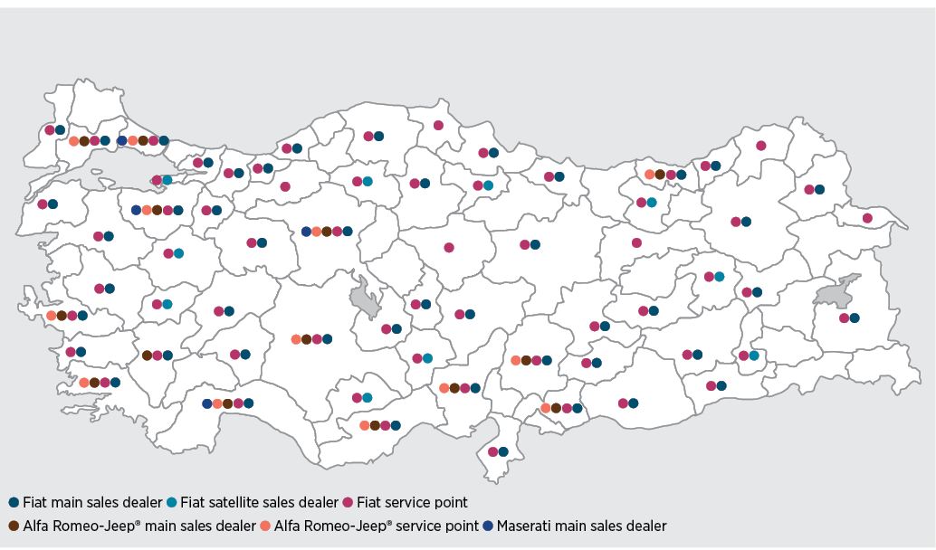 All 71 of the Fiat dealers in the network also service the company’s Alfa Romeo, Jeep® and Maserati brands. With the inclusion of the satellite and authorized service points not associated with the premises of the network’s dealerships, there are 101 Fiat sales points and 126 Fiat service points located all over Türkiye. There are also 21 Alfa Romeo-Jeep® main dealerships, together with another three locations that only service the vehicles. The number of Maserati dealerships is three.
