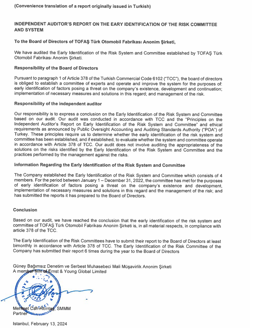 INDEPENDENT AUDITOR’S REPORT ON THE EARLY IDENTIFICATION OF THE RISK COMMITTEE AND SYSTEM