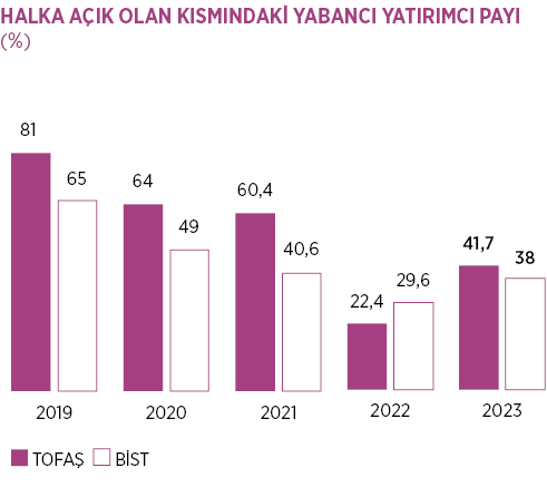 Tofaş hissesi yabancı yatırımcı payı 2023 yılı sonunda %41,7 olarak gerçekleşmiştir. Aynı donemde BİST yabancı yatırımcı payı ise %38’dir.