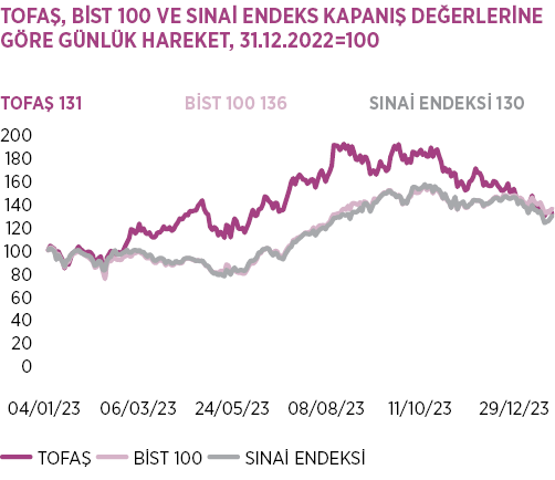 Tofaş hissesinin 2023 yılı ortalama değeri, 2022 yılı ortalama değerine göre %164 artış göstererek aynı dönemde ortalama %113 oranında değer kazanan BİST 100’e göre daha güçlü bir performans sergilemiştir. Yıl sonunda gerçekleşen fiyat seviyeleri göz önünde bulundurulduğunda, Tofaş hissesi 2023 yılında %31 oranında artış gösterirken aynı dönemde BİST 100 %35,6 artış performansı göstermiştir.