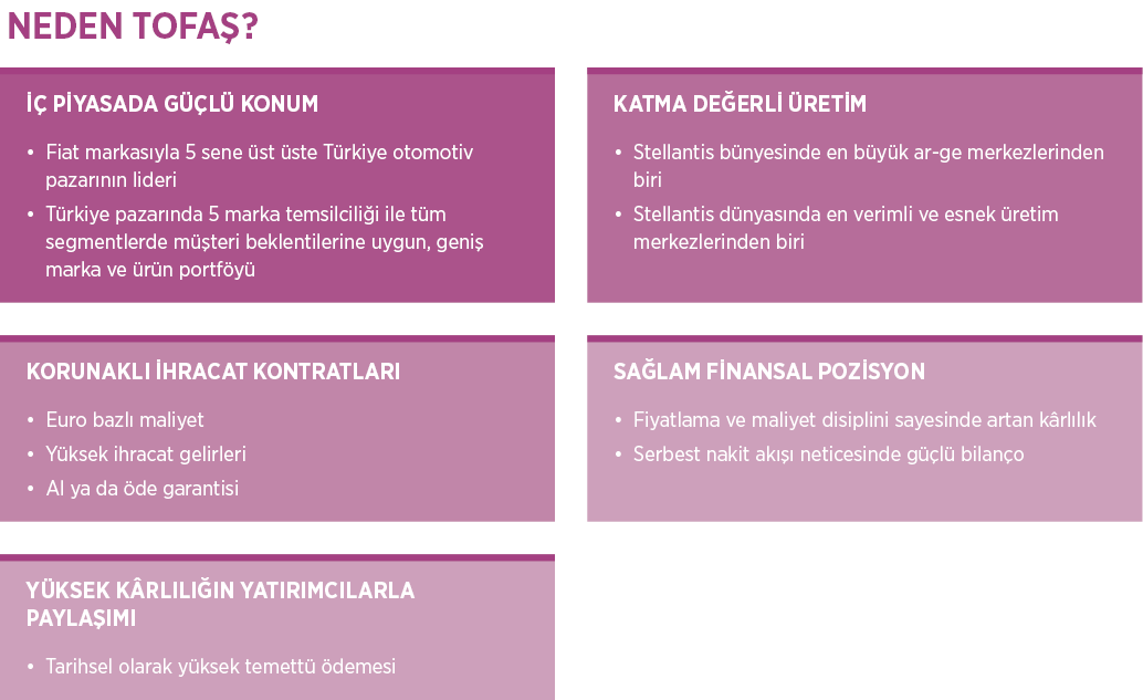 Koç Holding ile Stellantis’in eşit hissedar olduğu Tofaş’ın %24,3’ü halka açık olan hisseleri, Borsa İstanbul BİST 30 ve BİST 100 endekslerinde işlem görmektedir. Ayrıca Tofaş, BİST Kurumsal Yönetim Endeksi ve Sürdürülebilirlik Endeksi’nde de yer almaktadır. Karbon Saydamlık Projesi (CDP) iklim ve su programlarına yanıt vermektedir.