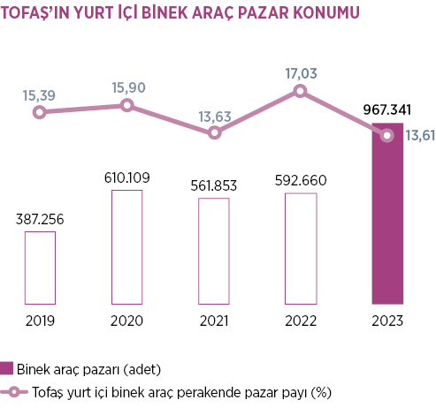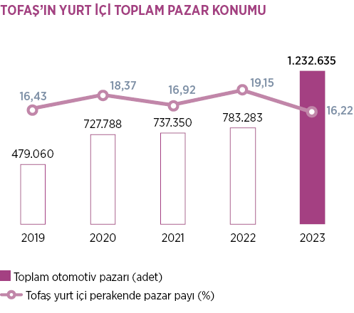 Tofaş’ın 2023 toplam yurt içi binek araç perakende pazar payı 131.625 adet satış ile %13,6 olarak gerçekleşmiştir.
