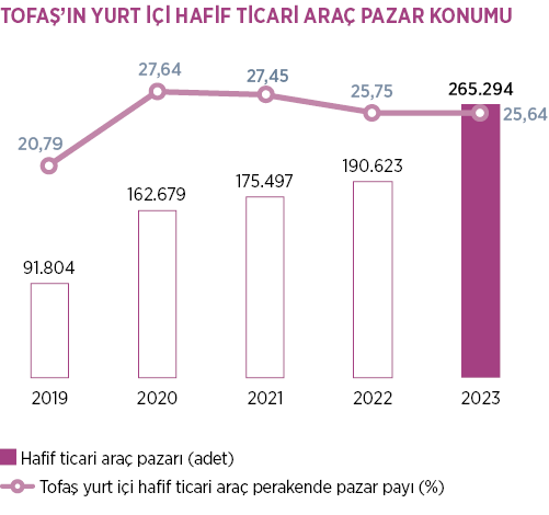 Hafif ticari araç pazarı bir önceki yıla göre %39,2 büyüme kaydederek 265.294 adet olarak gerçekleşmiştir. Tofaş 2023 yılında Fiat ve Fiat Professional markalarıyla, hafif ticari araç pazarında %25,7 pazar payı ile güçlü konumunu korumuştur.