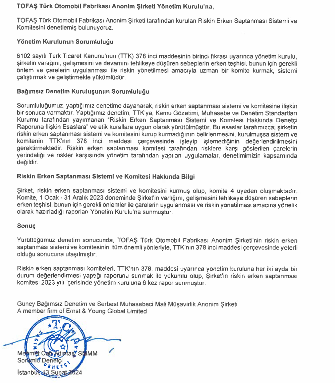 RİSKİN ERKEN SAPTANMASI SİSTEMİ VE KOMİTESİ HAKKINDA DENETÇİ RAPORU
