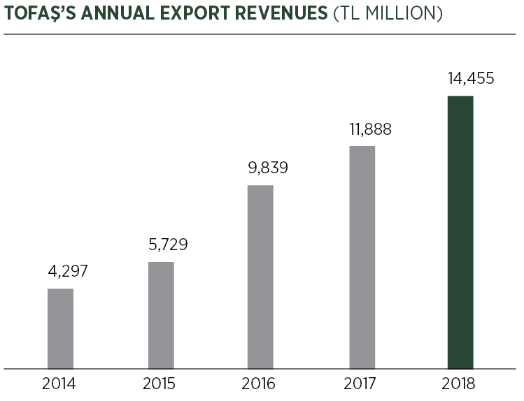 In 2018 Tofaş saw its export performance falter somewhat: the 243,833 units that the company shipped abroad corresponded to a 9.9% twelve-month contraction. These results gave Tofaş an 18.5% share of Turkey’s 2018 exports as measured by volume.