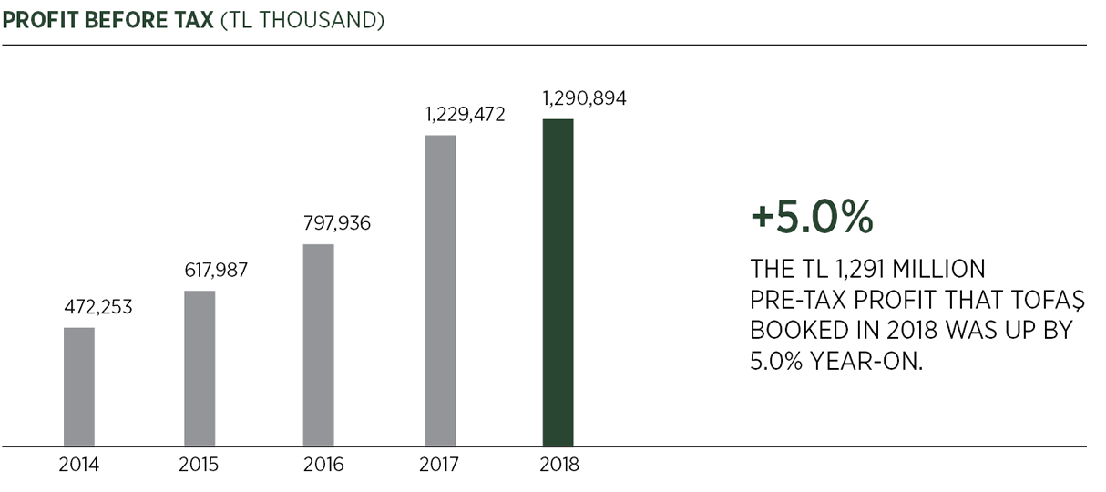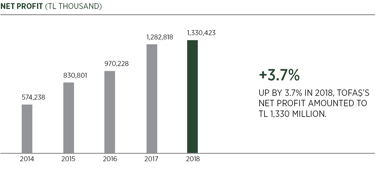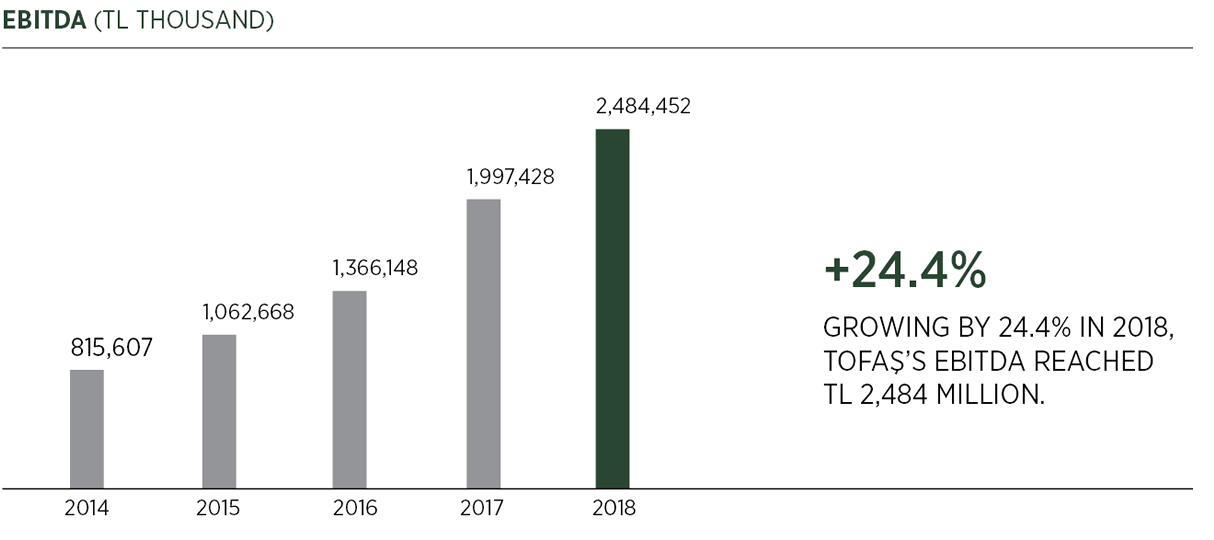 Tofaş registered historically high levels in all income items in 2018. The company’s net profit increased by 3.7% year-on and amounted to TL 1,330 million while its consolidated pre-tax profit was up by 5% and weighed in at TL 1,291 million. Tofaş’s EBITDA grew by 24.4% year-on and reached TL 2,484 million.